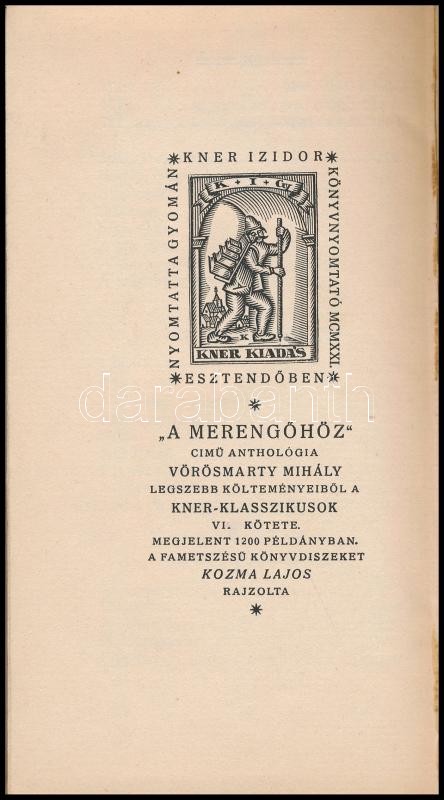 Vörösmarty Mihály: A merengőhöz. Anthológia Vörösmarty Mihály legszebb költeményeiből. Kozma Lajos fametszetű könyvdíszeivel illusztrált.Kner Klasszikusok VI. köt. Gyoma, 1921, Kner Izidor, 191 p. Kiadói félvászon-kötés. Megjelent 1200 példányban.
