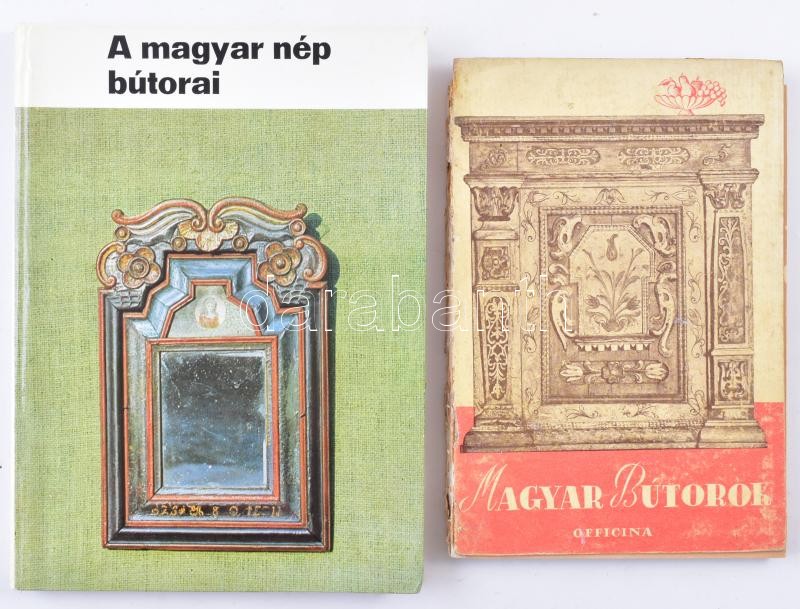 Magyar bútorok témájú könyvtétel, 2 db. K. Csilléry Klára: A magyar nép bútorai. A magyar népművészet 4. Bp., (1974), Corvina. Második kiadás. Kiadói kartonált papírkötésben, jó állapotban. + Bárányné Oberschall Magda: Magyar bútorok. Budapest, 1944, Officina. Második kiadás. Viseltes kiadói karton kötésben, levált borítóval, hiányzó gerinccel.