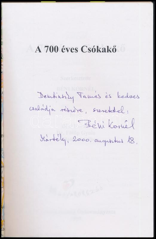 Béni Kornél- Dr. Fülöp Gyula- Dr. Hatházi Gábor: A 700 éves Csókakő. Hn., 1999, Csókakő Község Önkormányzatának kiadása. Papírkötésben, szép állapotban. Béni Kornél, szerző által dedikált példány.