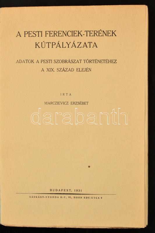 Marczievicz Erzsébet: A pesti Ferenciek-terének kútpályázata. Adatok a pesti szobrászat történetéhez a XIX. század elején. Bp., 1931, Sárkány-Nyomda Rt., 59 p.+ X t. Kiadói papírkötésben, szakadozott borítóval, felvágatlan példány.