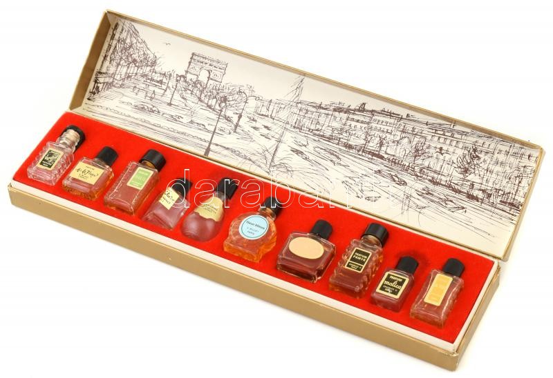 Leírás: 10 db-os mini parfüm sorozat, hiányos tartalommal, sérült kupakkal, eredeti dobozában