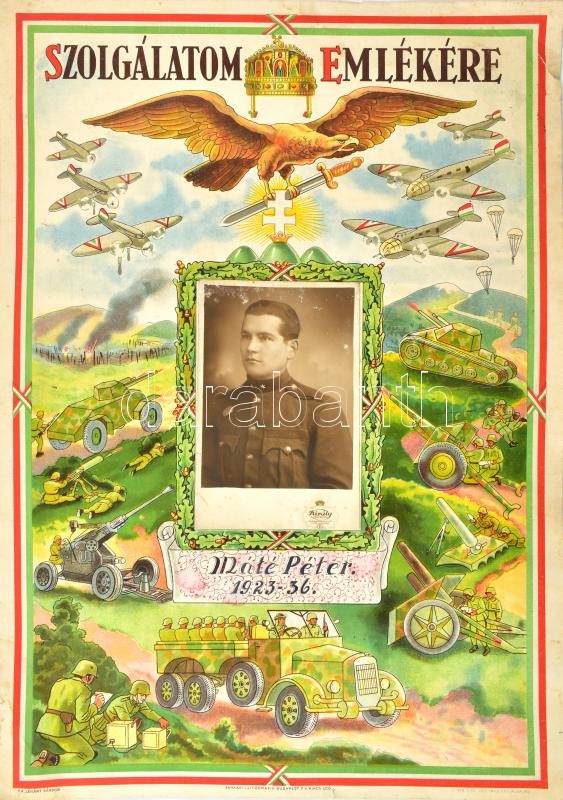 cca 1936-42 Katonai emléklap, kopott fényképpel, litográfia, lap közepén hajtásnyommal, jobb felső sarkában kisebb szakadással, lap tetején és alján apró szakadásokkal, szélein kissé foltos, 42,5x30 cm