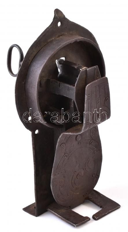 Leírás: Antik, XVIII. sz. míves, díszes fém lakat kulccsal, működik kopott, 14x9 cm