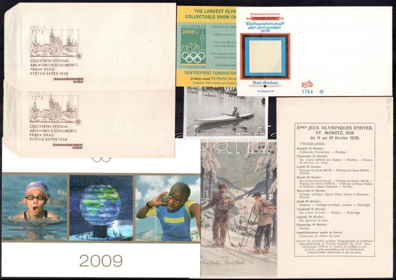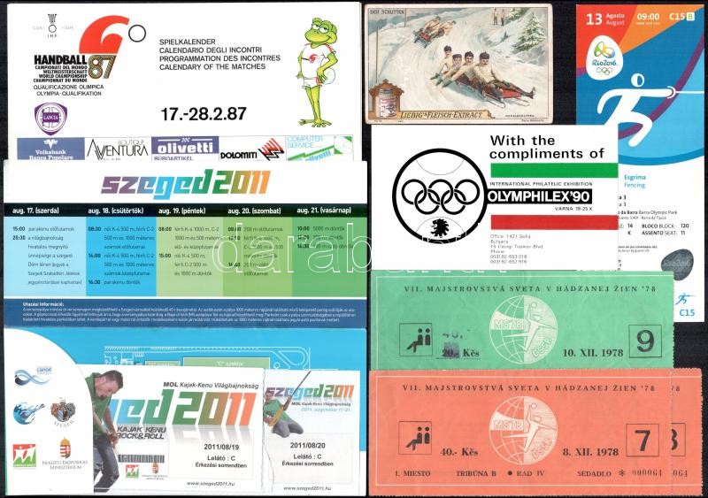 Leírás: Sport tárgyú nyomtatványok, belépőjegyek, levélzárók, borítékok, stb.