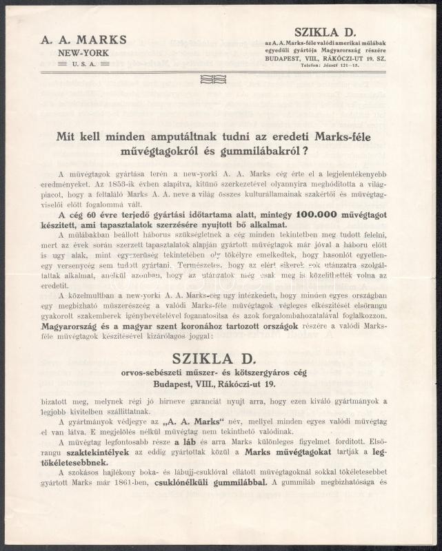 cca 1930 Szikla D. az A. A. Marks-féle valódi amerikai műlábak forgalm... https://www.darabanth.com/hu/392-Gyorsarveres/392.0/Mutargy-papirregiseg-egyeb/Nyomtatvanyok~500032/cca-1930-Szikla-D-az-A-A-Marks-fele-valodi-amerikai-mulabak-forgalmazoja-tajekoztato-pro~II2374566