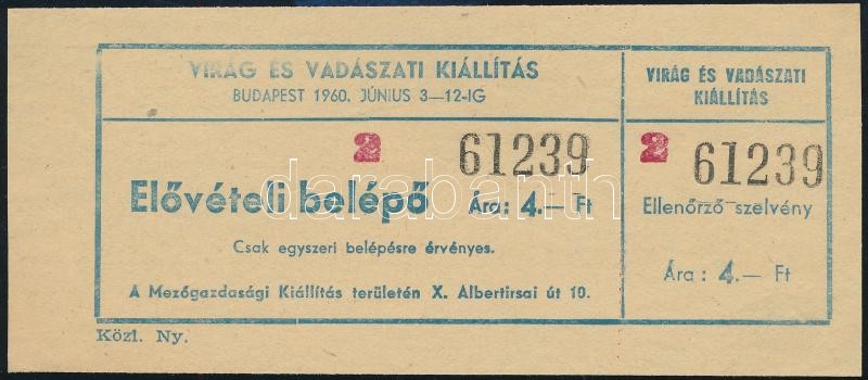 Leírás: 1960 Virág és Vadászati Kiállítás belépőjegy ellenőrzőszelvénnyel