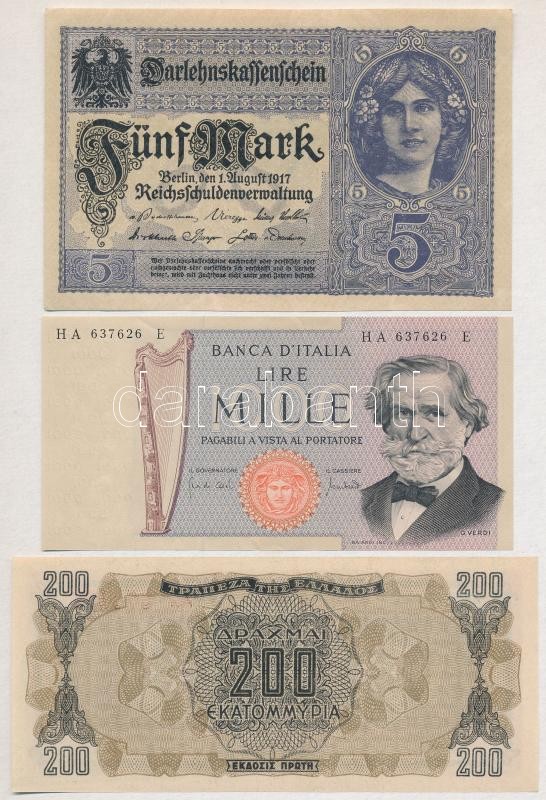 Mixed: Greece 1944. 200 Drachmai + Mexico 1982. 100 Pesos + German Empire 1917. 5 Mark + Italy 1969. 1000 Lire + Romania 1999. 2000 Lei (2x) C:UNC-F