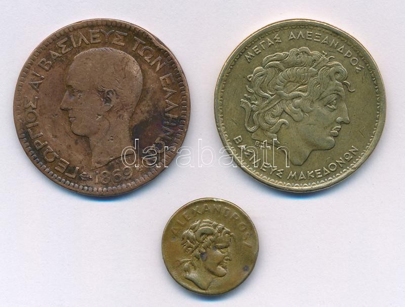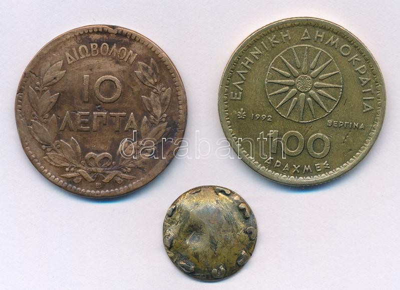 Leírás: Görögország 1869. 10l "I. György" + 1992. 100Dr Cu-Ni + "Nagy Sándor" fém zseton T:2-3