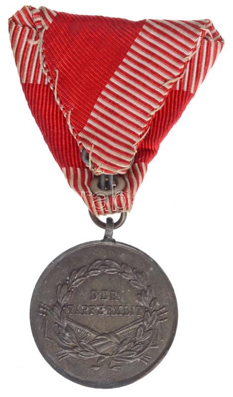 Leírás: 1914. "Ferenc József Bronz Vitézségi Érem" hadifém kitüntetés mellszalaggal T:2 durva ph. / Hungary 1914. "Bronze Gallantry Medal" war metal decoration with ribbon C:XF strong edge error NMK 137.