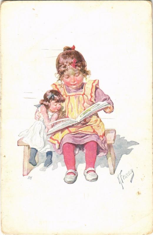 Leírás: Children art postcard, girl with doll. B.K.W.I. 525-2. s: K. Feiertag (EB)