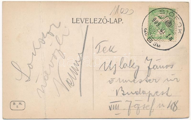 Leírás: 1909 Siófok, Fürdőtelepi kávéház, kert vendégekkel és pincérekkel (fa)