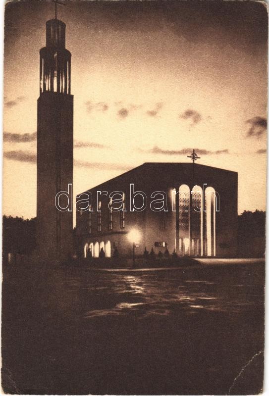 Leírás: Budapest II. Pasaréti Ferences templom esti kivilágításban. Tervezte Klimanóczy Gyula építész. Révész-Biró felvétele (EB)