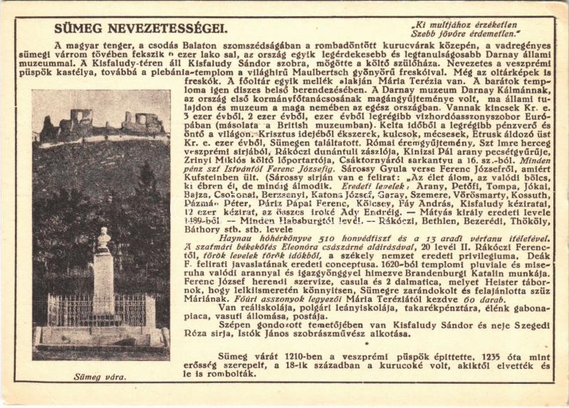 Sümeg, vár, Kisfaludy Sándor szobor. Sümeg nevezetességei. Knopfmacher... https://www.darabanth.com/hu/393-Gyorsarveres/393.0/Kepeslapok/Magyarorszag~1500005/Sumeg-var-Kisfaludy-Sandor-szobor-Sumeg-nevezetessegei-Knopfmacher-felvetele-Farkasfalvi-~II2381123