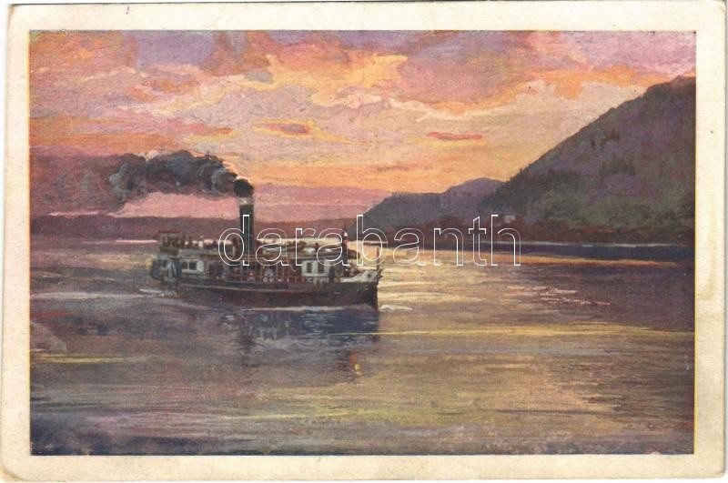 Leírás: Visegrád, Esti hangulat Visegrádnál, gőzhajó. Művészlevelezőlap M.F.T.R. 6314-5. (EB)