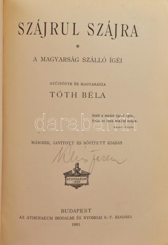 Tóth Béla: Szájrul-szájra. A magyarság és szálló igéi. Bp., 1901, Athenaeum, XV+506+2 p. Második, javított és bővített kiadás. Kiadói aranyozott egészvászon-kötés, kissé kopott borítóval, 'Dr. Szöllősy Oszkár' könyveiből ex libris-szel.