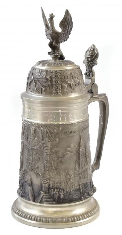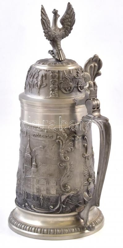 Díszes lengyel ón korsó varsói városképekkel (óváros, királyi palota), címerrel, katonai motívumokkal, tetején sassal, "Poliart" jelzéssel. m: 26 cm, d: 11 cm