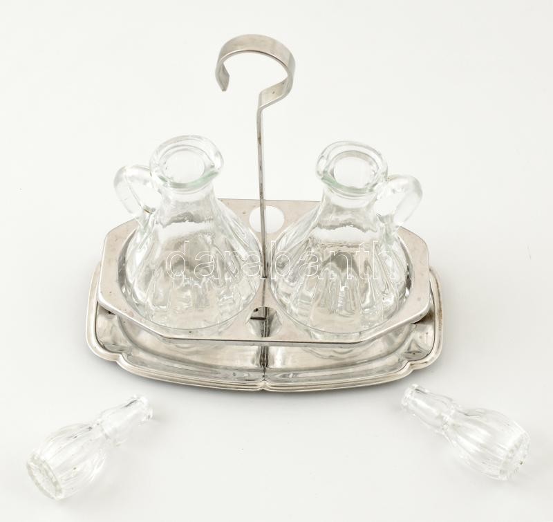 Leírás: Ecet és olaj tartó asztali készlet. Üveg, fém. 23 cm