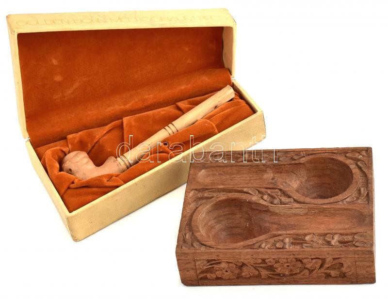 Leírás: Golden Horn Meerschaum tajtékpipa figurális díszítéssel, eredeti dobozában, hozzá faragott fa pipatartó 14x11 cm
