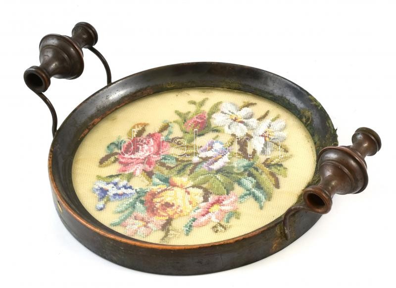 Leírás: Kis réz tálca, gobelin betéttel d: 16,5 cm