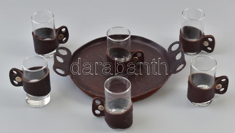 Leírás: Kupicás készlet, 6 db, bőr tálcával és bőr fogókkal, kis kopásnyomokkal, m: 8 cmx6, d: 18,5 cm