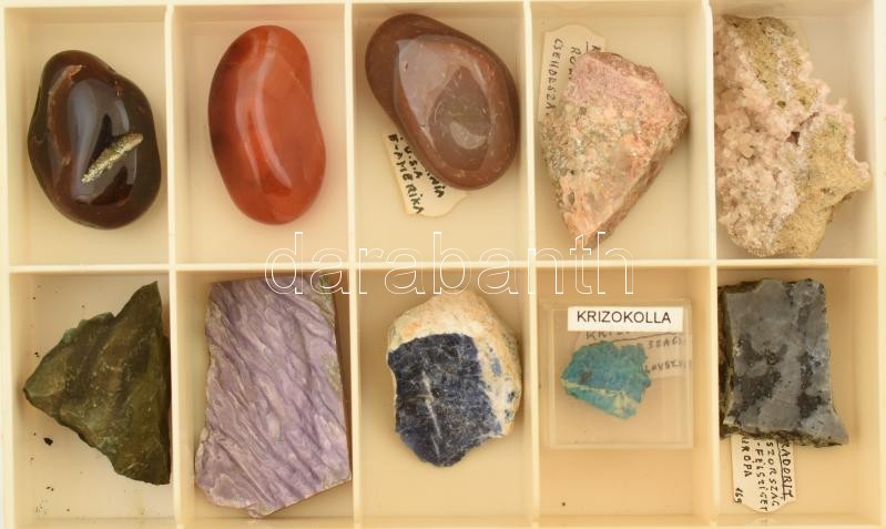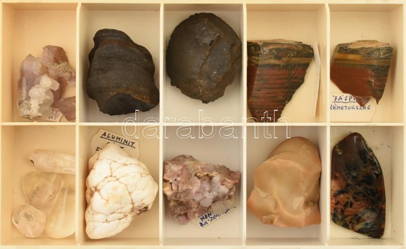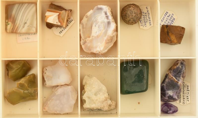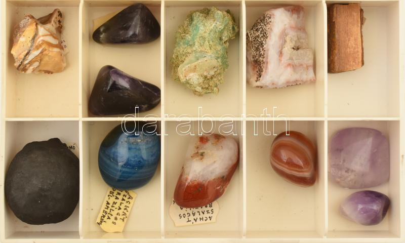 Óriási féldrágakő és ásvány gyűjtemény. 45 darab 10 fakkos dobozban több száz nemes kő precízen ásványcsoportokként külön gyűjtve, a kövek nagyrészt azonosítva és felcímkézve. Például: Jáspis, nefrit, tűzopál, ónix.és még felsorolhatatlanul sok más.