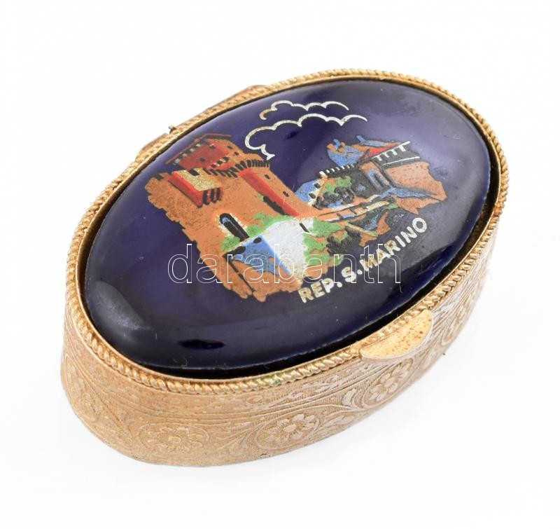 Leírás: San Marino fém ékszeres dobozka, jó állapotban, 3×4,5×1,5 cm