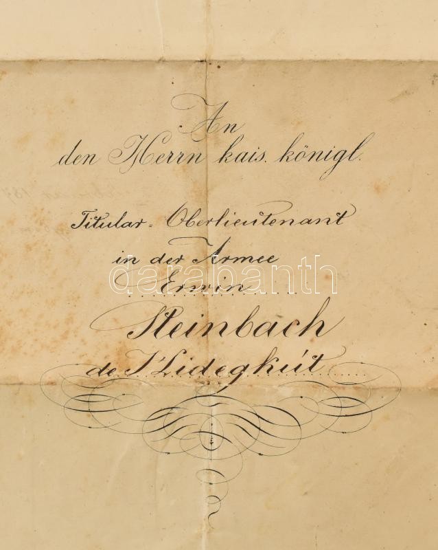 1870 Főhadnagyi kinevezés hidegkuti Steinbach Ervin részére az 5. gróf Radetzky huszárezredbe. Hajtva / Appointing warrant for the Radetzky hussar regiment. 25x38 cm