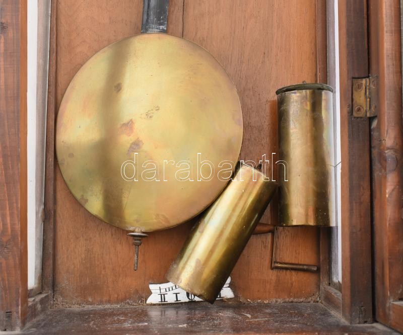 Felesütős fali inagaóra. XIX. sz. magyar, Jelzett Sziklai Budapest. Szép állapotú zománc számlappal, ráz súlyokkal. Jó állapotú faragott fa tokkal, üvegezett, Kis repedéssel a tokon, kis javításra szorul, felzúzó kulccsal. 125 cm