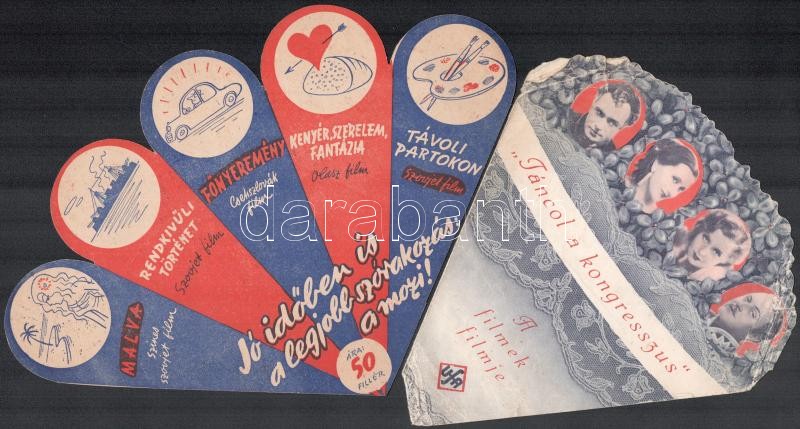 cca 1930-1960 Mozifilm reklámok: A kék angyal (Emil Jannings), füzet kisebb szakadásokkal + 2 db legyező alakú reklámlap (Táncol a kongresszus, Kigyúlnak a fények, stb.), az egyik kihajtható, viseltes állapotban