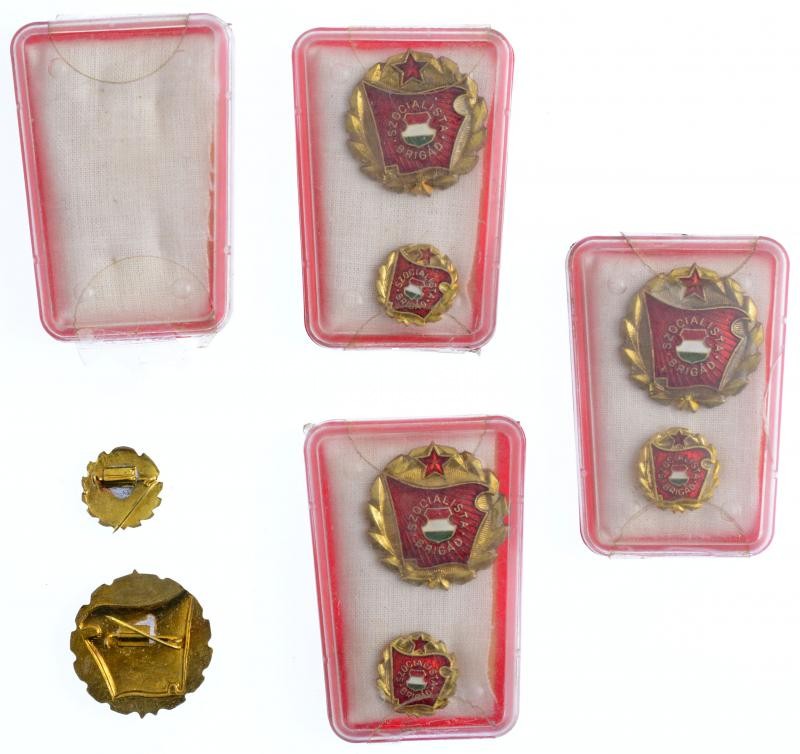 Leírás: ~1970-1980. "Szocialista Brigád" aranyozott, műgyantás jelvény miniatűrrel, műanyag tokban (4x) T:1-