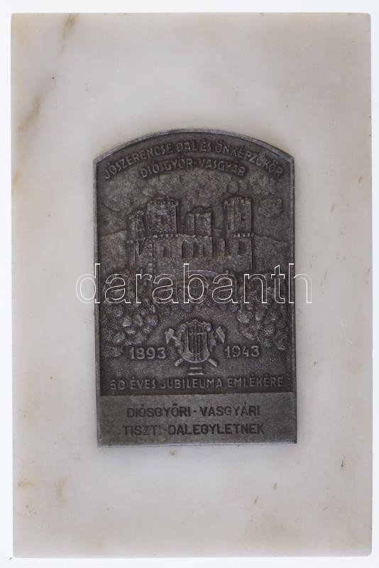 Leírás: 1943. "Jószerencse Dal és Önképzőkör - Diósgyőr Vasgyár - 1893-1943 - 50 éves jubileuma emlékére - Diósgyőri Vasgyári Tiszti Dalegyletnek" fém plakett (55x97mm) márványtalapzathoz erősítve (100x153x16mm) T:2