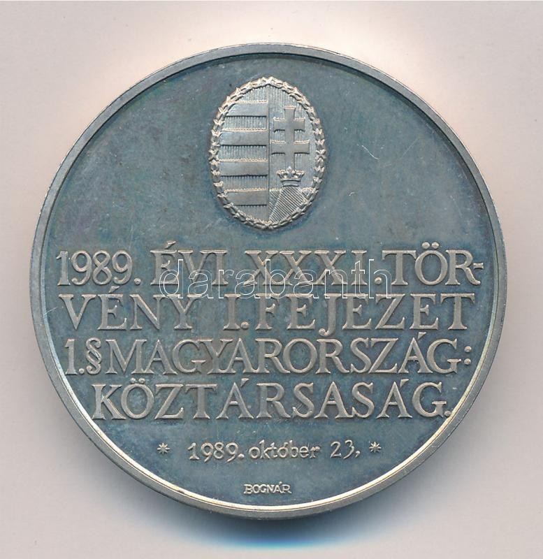Bognár György (1944-) 1990. "Magyar Éremgyűjtők Egyesülete / 1989. évi XXXI. törvény I. fejezet 1§ Magyarország: Köztársaság. - 1989. október 23." Ag emlékérem (71,91g/0.835/42,5mm) T:1- (PP)