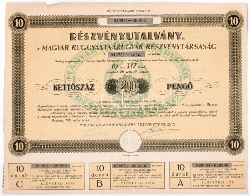 Leírás: Budapest 1946. "Magyar Ruggyantaárugyár Részvénytársaság" részvényutalványa 200P-ről, szelvényekkel és szárazpecséttel T:II- kis szakadás