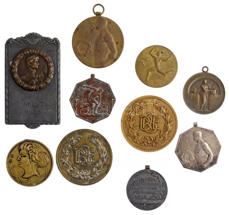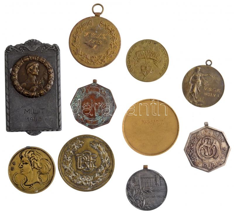 Leírás: 10db-os vegyes sportérem- és plakett tétel, közte 1941. "Budapest Sport Egyesület - Budapest Bajnokság 1941" kétoldalas Br emlékérem (30mm) T:vegyes