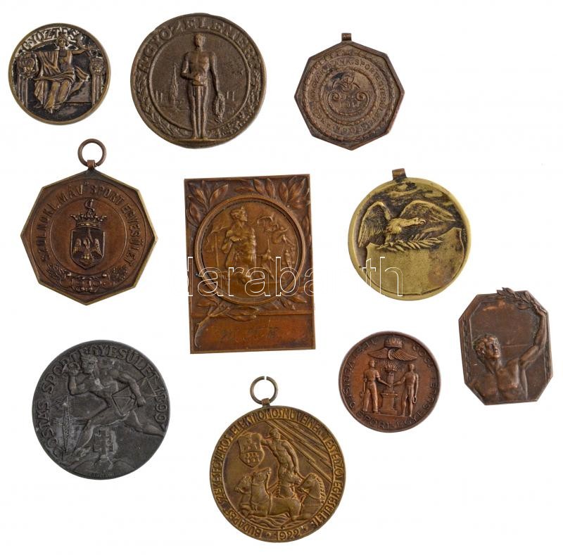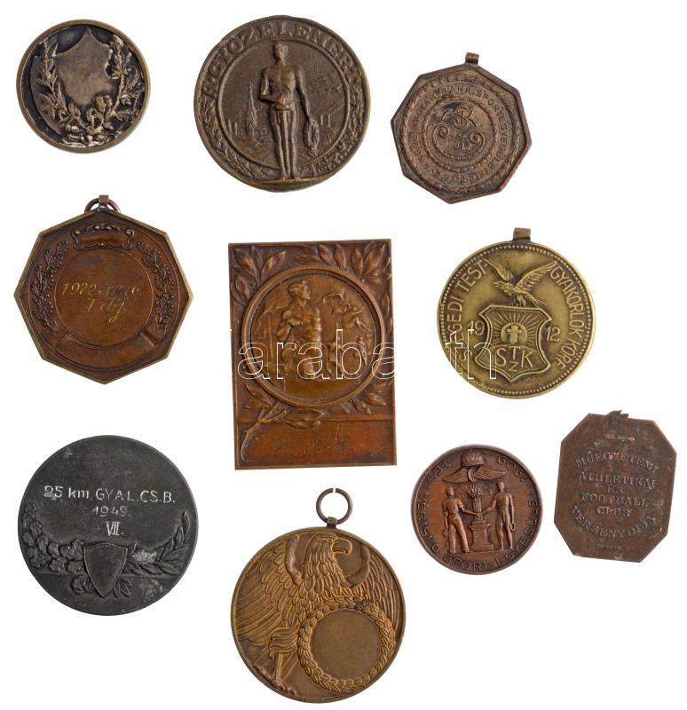 Leírás: 10db-os vegyes sportéremtétel, közte ~1930. "Testvériség Sport Egyesület 1909" Br emlékérem (30mm) T.:vegyes