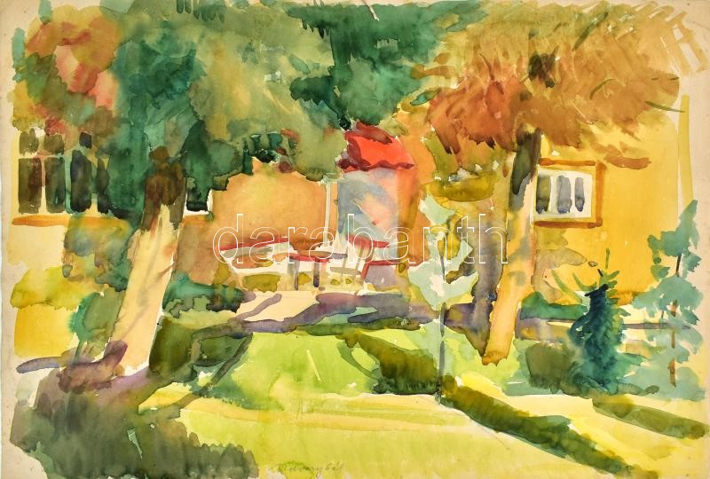Leírás: Udvary Pál (1900-1987): Kert. Akvarell, papír, jelzett, sérült (lap tetején szakadással), 30×43,5 cm
