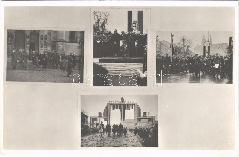 Leírás: 1938 Kassa, Kosice; bevonulás, díszkapu, magyar zászlók, Horthy Miklós és Purgly / entry of the Hungarian troops, decorated gate, flags + "1938 KASSA VISSZATÉRT" So. Stpl