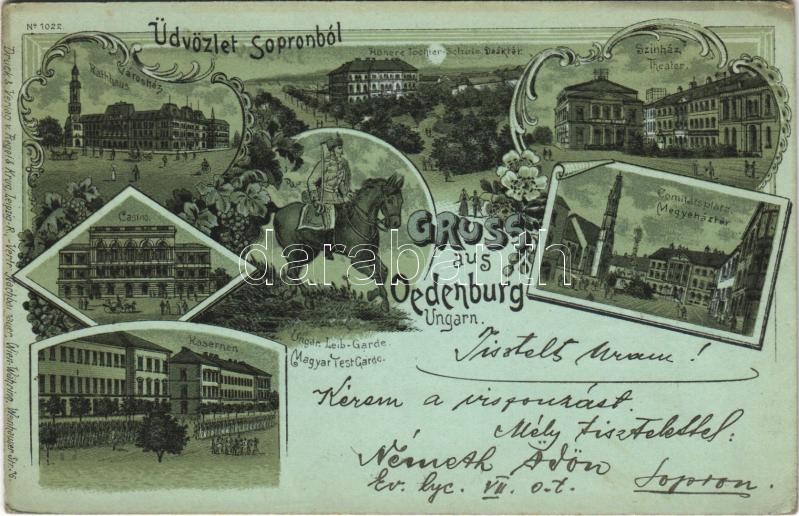 1898 (Vorläufer) Sopron, Oedenburg; Rathaus, Höhere-Tochter-Schule, Theater, Casino, Comitatsplatz, Kasernen, Ungar. Leib-Garde / Városház, Felső leány iskola, Deák tér, Színház, Kaszinó, Megyeház tér, Katonai laktanya, Magyar testőr. Regel & Krug No. 1022. Art Nouveau, floral, litho (EK)