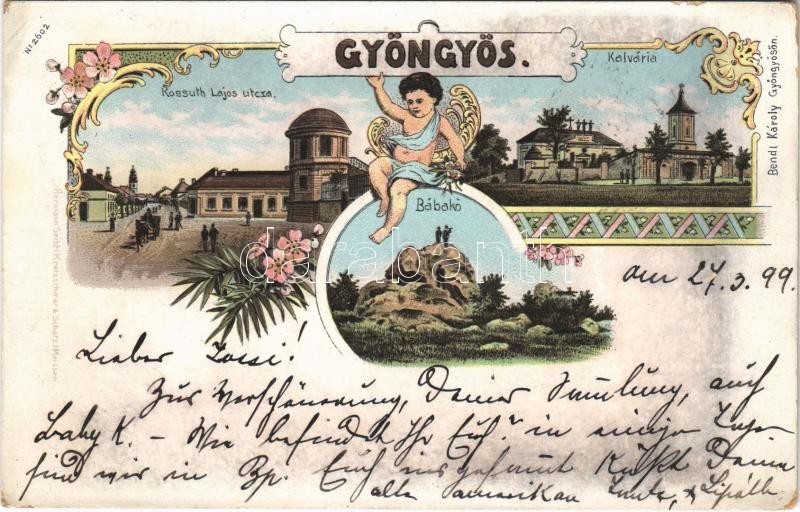 Leírás: 1899 (Vorläufer) Gyöngyös, Kossuth Lajos utca, Bábakő, Kálvária, puttó. Bendl Károly kiadása, floral, Art Nouveau, litho