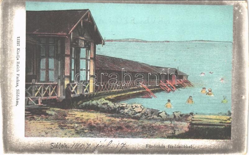 1907 Siófok, Fürdőház fürdőzőkkel. Reich Farkas kiadása (vágott / cut) https://www.darabanth.com/hu/394-Gyorsarveres/394.0/Kepeslapok/Magyarorszag~1500005/1907-Siofok-Furdohaz-furdozokkel-Reich-Farkas-kiadasa-vagott-cut~II2393430