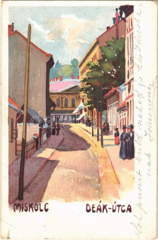Leírás: 1910 Miskolc, Deák utca. Ferenczi Károly kiadása. művészlap s: Kiss L. (EB)