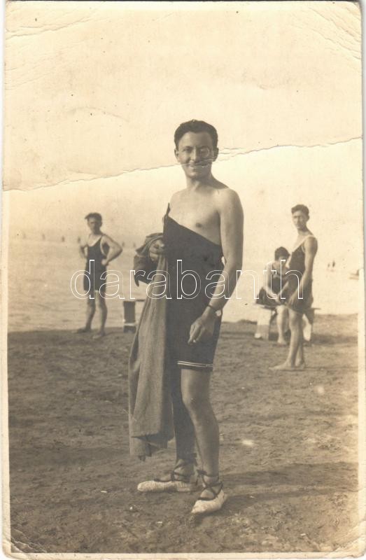 1923 Siófok, fürdőruhás férfiak a parton. photo (vágott / cut) https://www.darabanth.com/hu/394-Gyorsarveres/394.0/Kepeslapok/Magyarorszag~1500005/1923-Siofok-furdoruhas-ferfiak-a-parton-photo-vagott-cut~II2390061