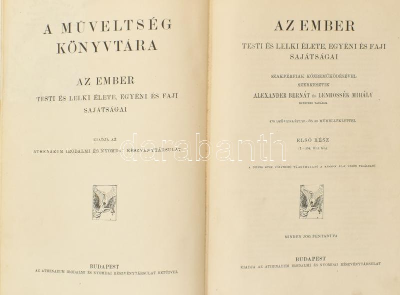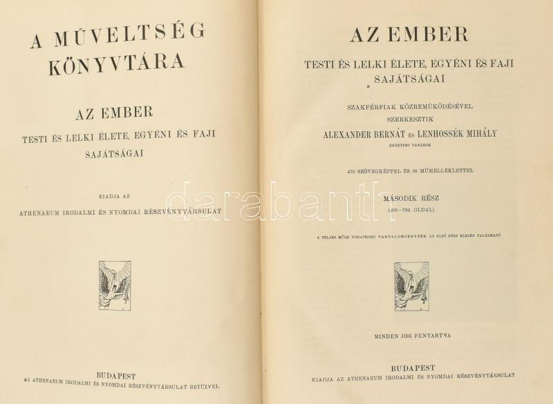 Alexander Bernát-Lenhossék Mihály: Az ember testi és lelki élete, egyéni és faji sajátságai I-II. Bp., Athenaeum. Kiadói félbőr kötés, kissé kopottas állapotban.