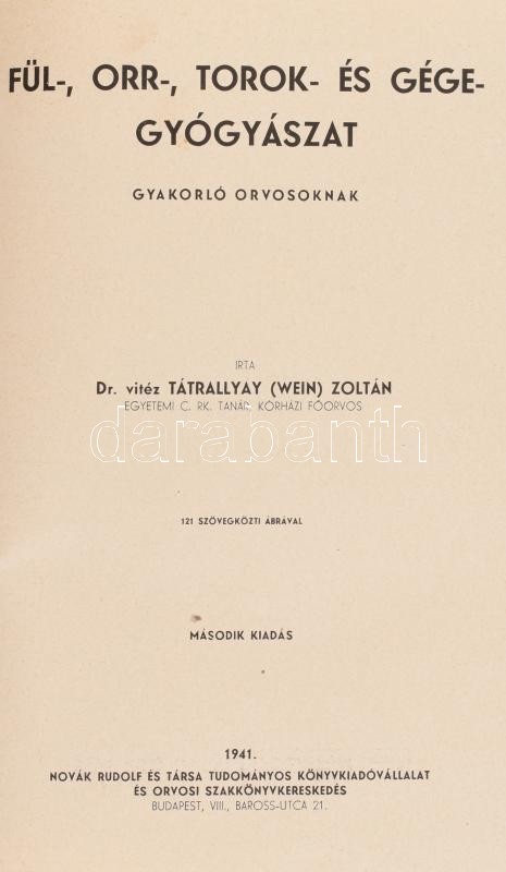 Dr. vitéz Tátrallyay (Wein) Zoltán: Fül-, orr-, torok- és gégegyógyász... https://www.darabanth.com/hu/394-Gyorsarveres/394.0/Konyvek/Konyvek-Termeszettudomany-medicina~1000010/Dr-vitez-Tatrallyay-Wein-Zoltan-Ful-orr-torok-es-gegegyogyaszat-Gyakorlo-orvosokn~II2388400