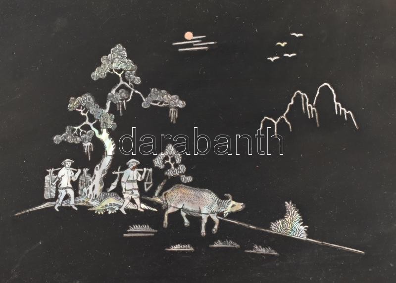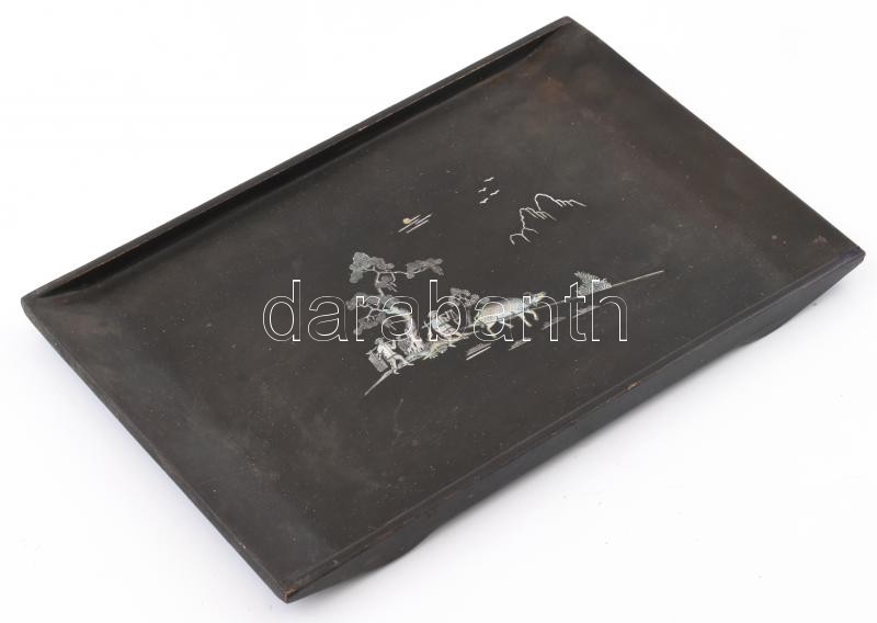 Leírás: Távol-keleti gyöngyház berakásos lakkozott fa tálca, kis sérülésekkel, 32x21 cm