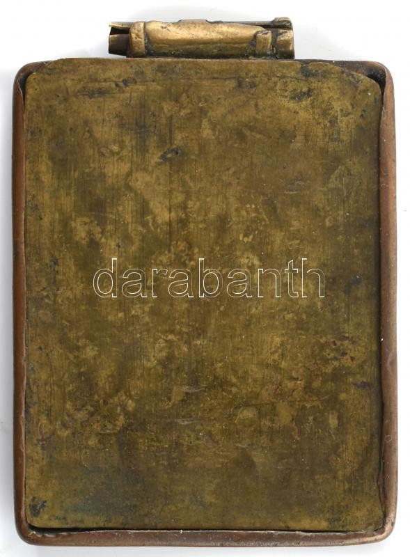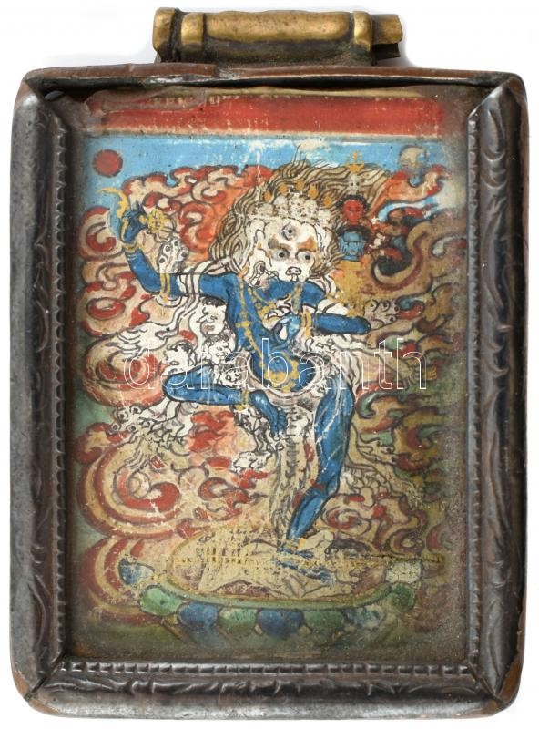 Leírás: Tibeti szentképes amulett, kissé sérült üvegezett réz keretben, 5,5x4 cm