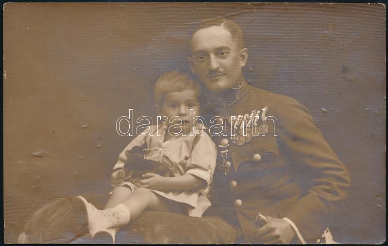 Leírás: 1923 Bp., Katonatiszt kitüntetésekkel kisfia társaságában, fotólap Rozgonyi műterméből, 8,5×13,5 cm