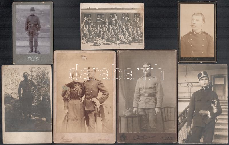 cca 1890-1920 össz. 7 db katonai fotó, többségében portré; egyik I. világháborús tábori posta fotólap, amelyen katona kitüntetéssel; további 4 db keményhátú fotó, részben kopott, foltos vagy sérült, 10,5x6,5 és 16x10,5 cm közötti méretben