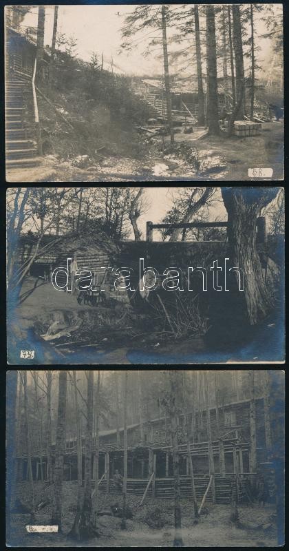 cca 1916 A Magyar Királyi 29. Honvéd Gyalogezred Parancsnokság fából épített létesítményei a fronton, 3 db fotó, hátoldalon a parancsnokság pecsétjével, jó állapotban, 9×14 cm