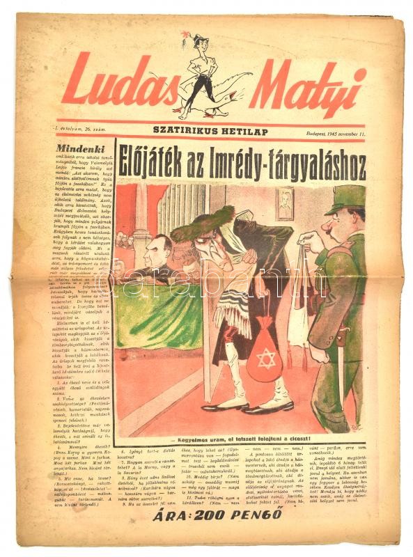 1945 Ludas Matyi. I. évf. 26. sz., 1945. nov. 1., foltos, 8 p. https://www.darabanth.com/hu/394-Gyorsarveres/394.0/Mutargy-papirregiseg-egyeb/Nyomtatvanyok~500032/1945-Ludas-Matyi-I-evf-26-sz-1945-nov-1-foltos-8-p~II2392726